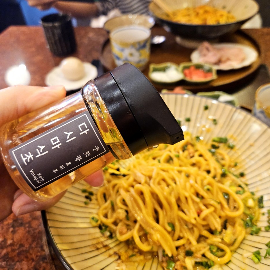 마제소바에서 빠질 수 없는 다시마 식초를 3~4바퀴 둘러주면,