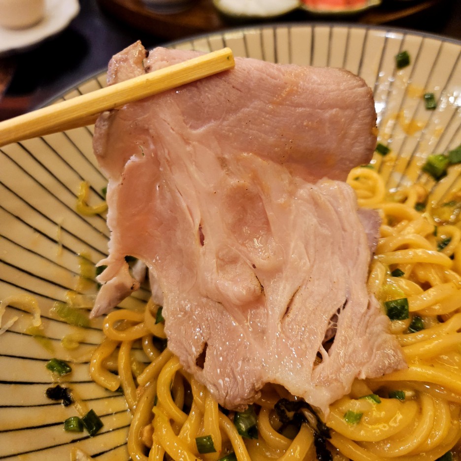 라멘에는 차슈가 기본으로 들어가 있지만 마제소바에는 기본이 아니라서 차슈를 먹고자 한다면 추가요금을 지불해야 한다. 라멘 국물에 들어가 있던 수비드목살차슈는 더욱 윤기가 나고 맛있어 보였는데, 그냥 받은 차슈는 비주얼에서는 조금 떨어지는 모습이었다.