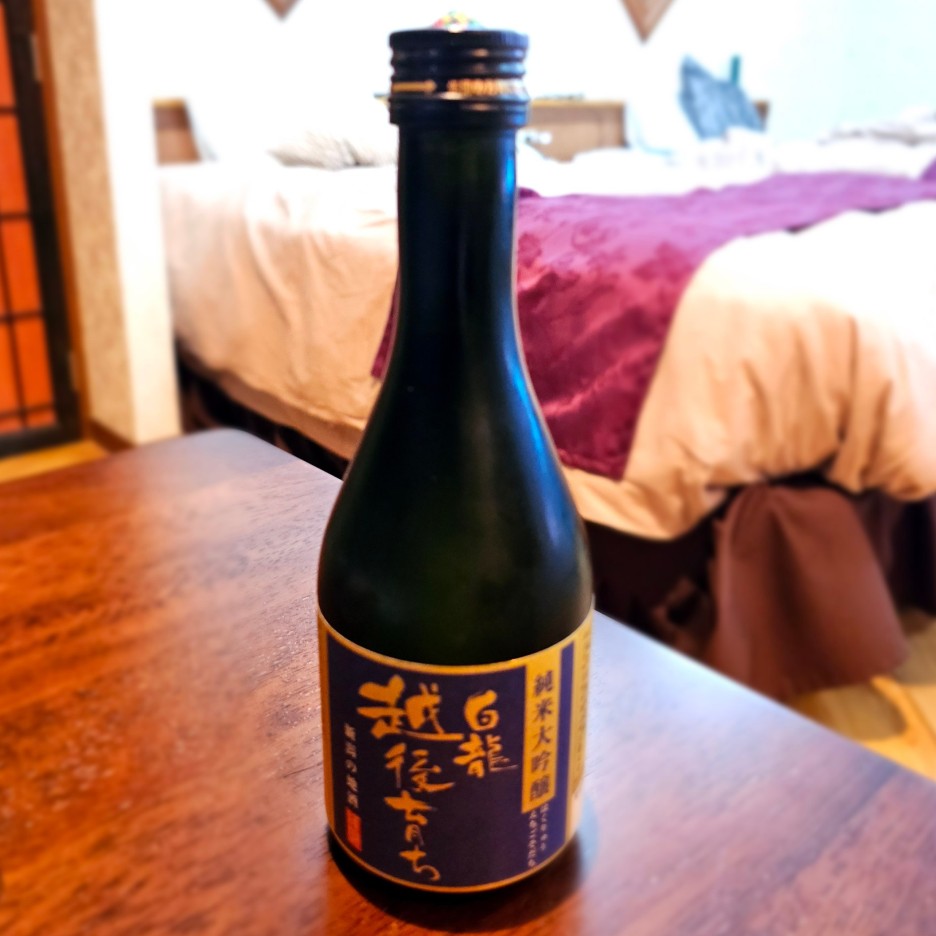 준마이다이긴조로, 니가타현 아가노시산 양조용 쌀 '고헤이만세이시'를 100% 사용하고, 향이 풍부하고 목 넘김이 부드러운 사케라고 한다.