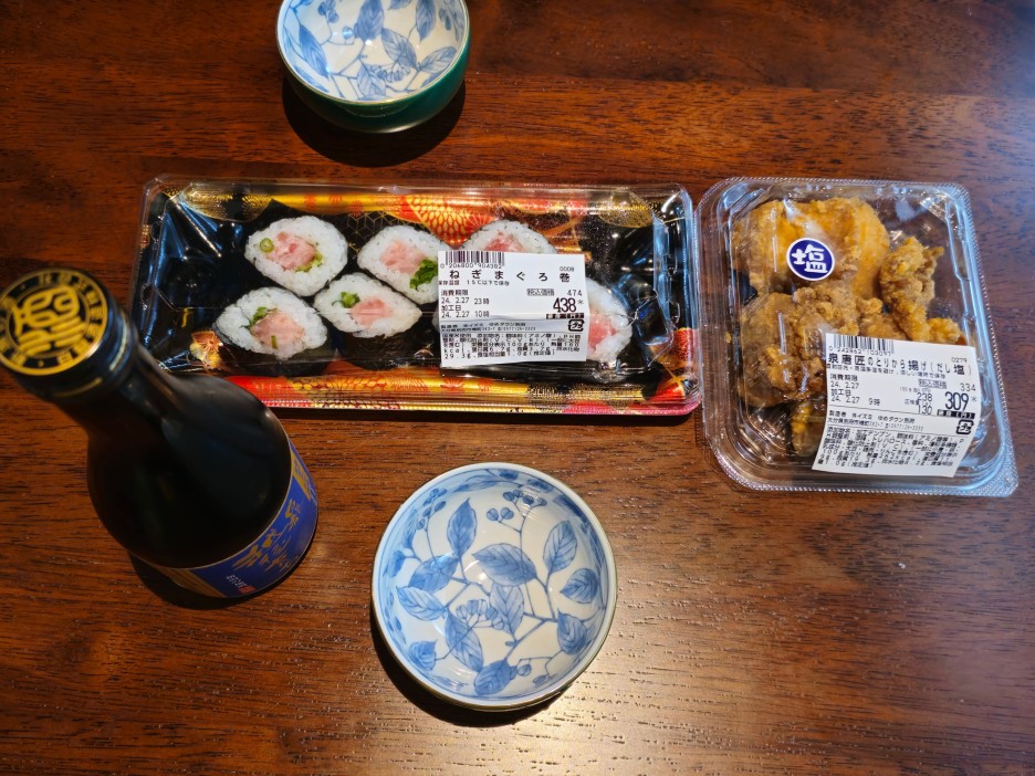 오늘의 야식은, 300m의 하프사이즈의 니가타현의 사케와, 네기마구로 마키, 그리고 가라아게.