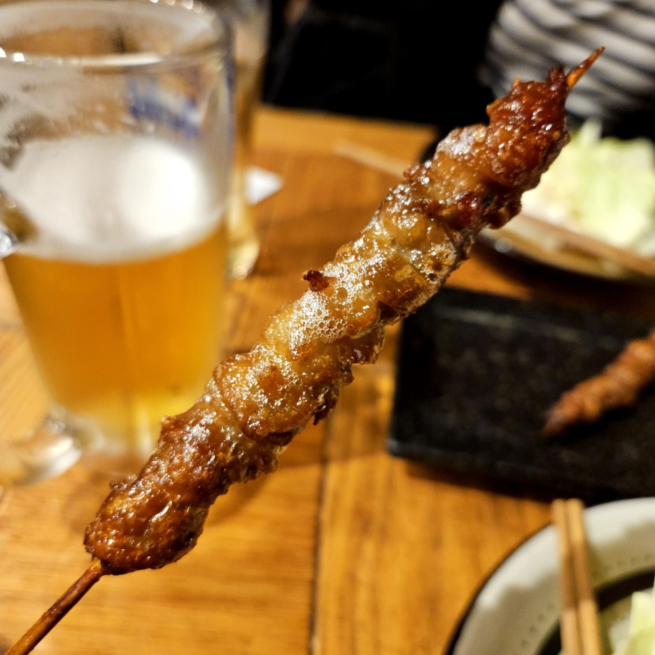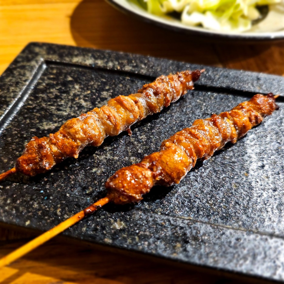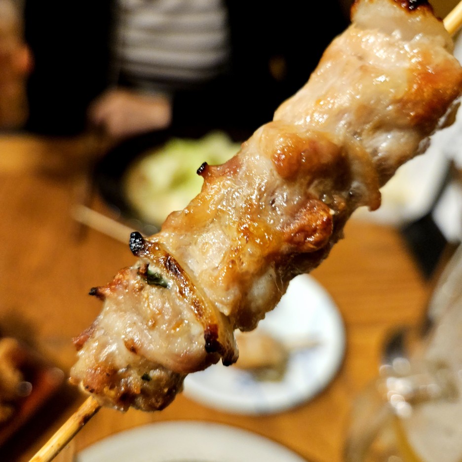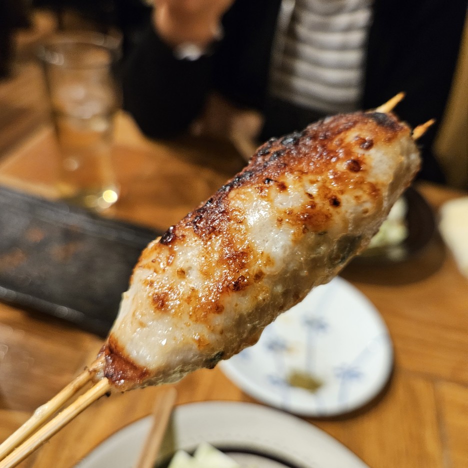 후쿠오카의 야키토리에서는 무조건 토리카와부터. 돌돌 말아져있는 닭 껍질이 아주 바삭하게 잘 구워졌다.