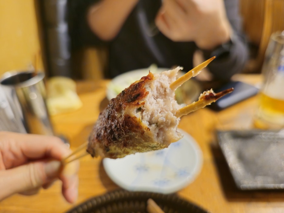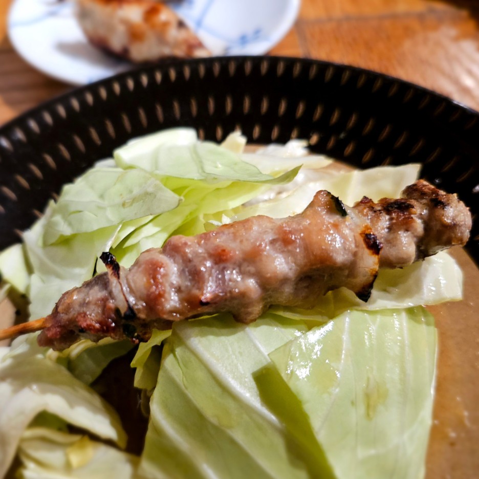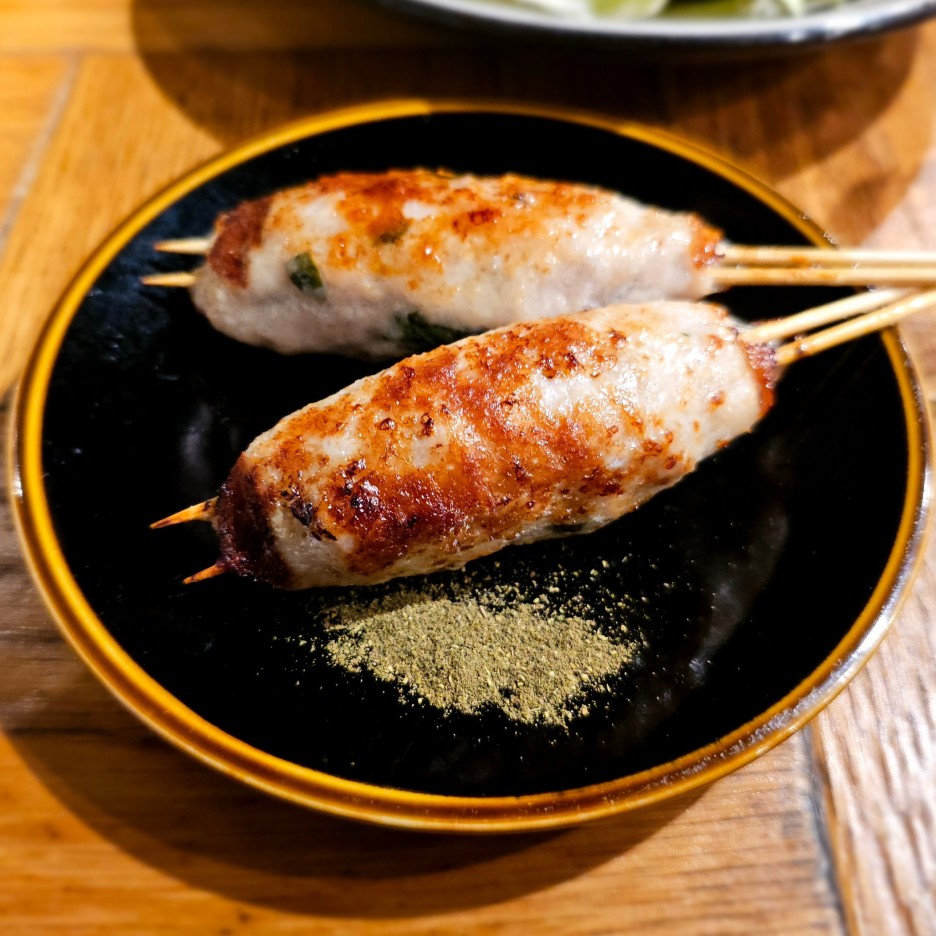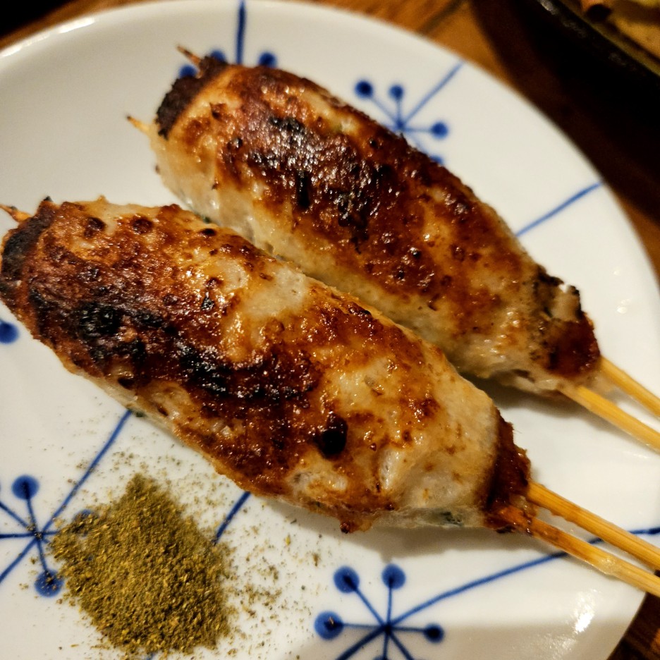 후쿠오카의 야키토리에서는 무조건 토리카와부터. 돌돌 말아져있는 닭 껍질이 아주 바삭하게 잘 구워졌다.