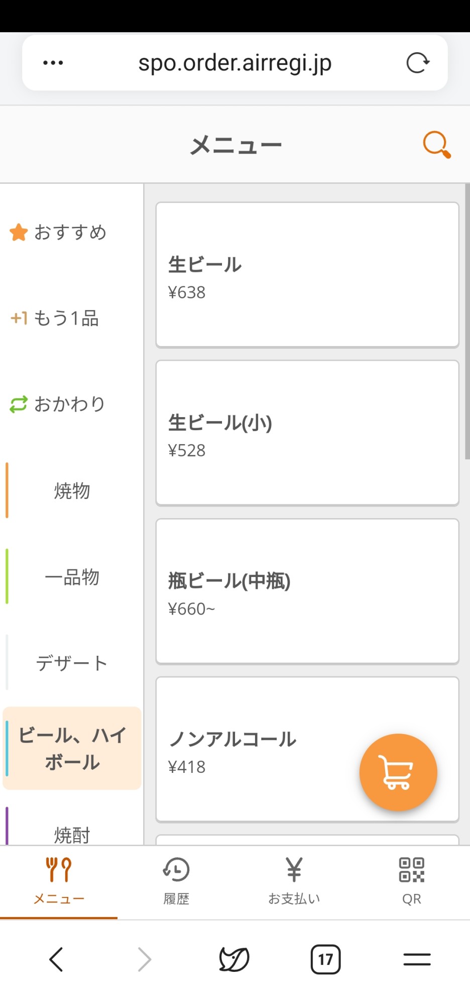 스캔을 하면 이렇게 웹 주문 페이지로 접속이 되며, 이곳에서 주문을 하면 된다.