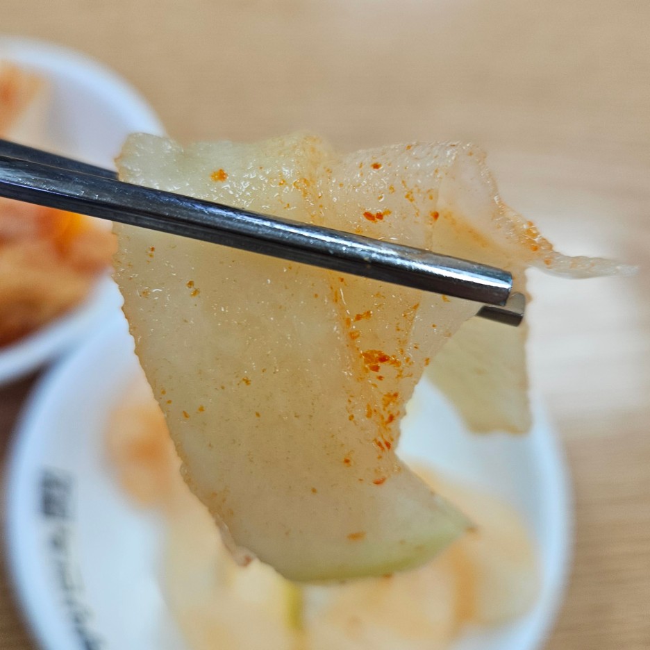 괜히 찍어보는 무 절임과 김치의 모습. 무 절임을 꽤 훌륭한 맛. 아삭한 식감에 적당한 산미.