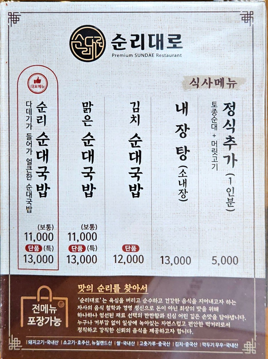 순리대로는 순대전문 프리미엄 패밀리 레스토랑을 지향하고 있다고 한다.