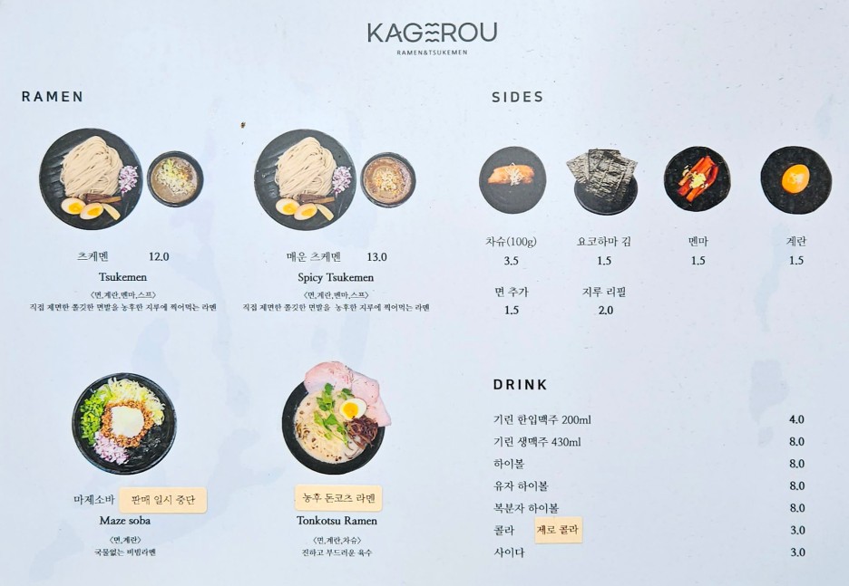 얼마 전 일본 여행에서 먹은 후쿠오카 츠케멘 인기점 카네토라는 면 추가도 무료에, 츠케멘 수프의 양도 훨씬 많았다. 기본 가격이 여기 카게로우 보다는 조금 더 비싸긴 하지만, 이것저것 추가하면 결국은 카게로우가 조금 더 비싼 느낌이 든다. 양재에서 이전한 후는 가성비라는 부분에서는 조금 많이 아쉬워졌다.