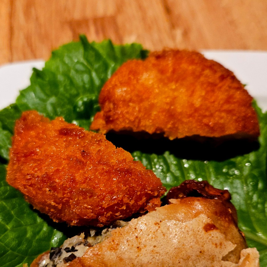 상당히 잘 튀겨진 튀김 안에 잘게 갈린 새우 살이 들어가 있다. 식빵이 없는 멘보샤다.