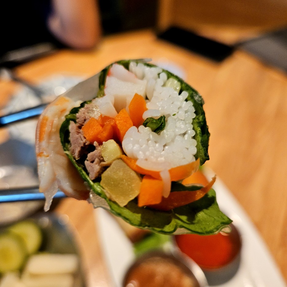 바삭하게 잘 튀겨진 라이스페이퍼 안에 다양한 고기와 야채가 꽉 차 있다. 괜찮은 맛.
