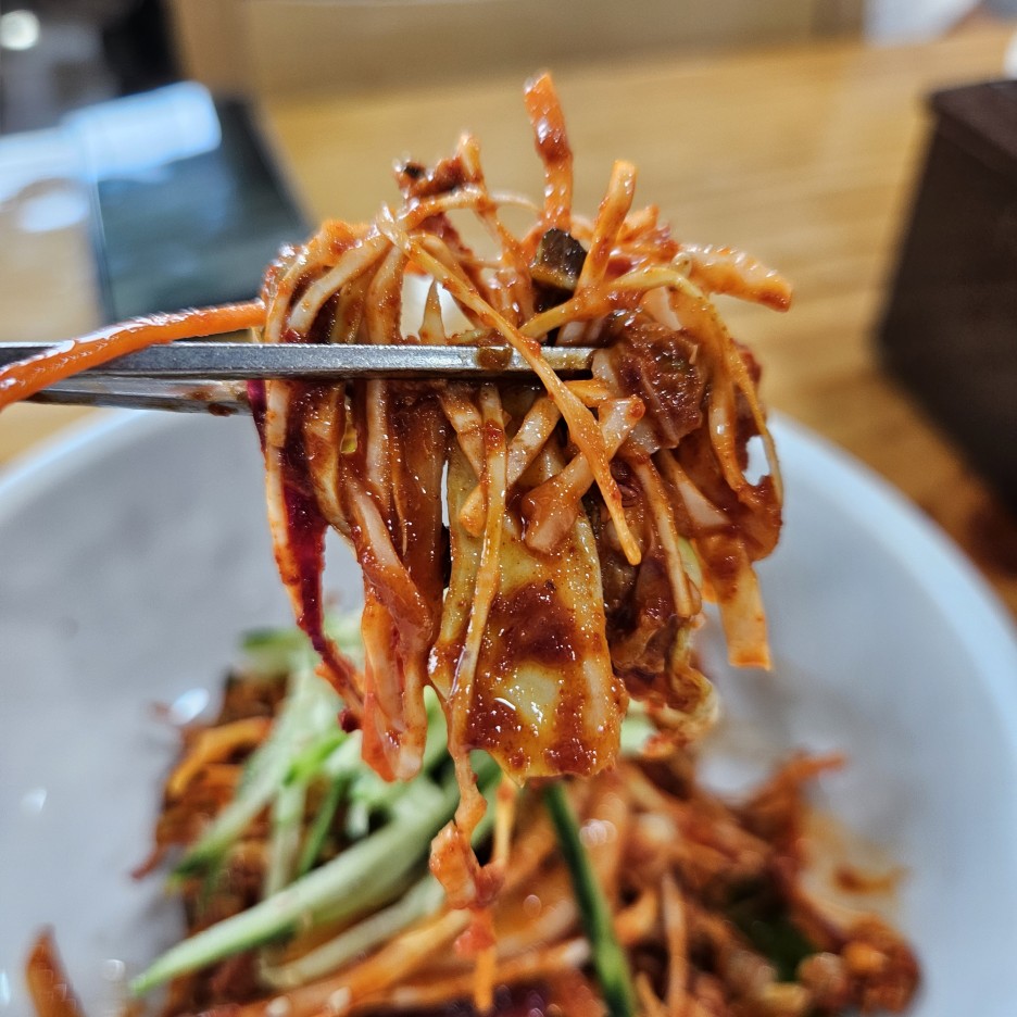 빨간 양념에 비벼진 내용물에는 주로 양배추가 있었고 재첩이 드문드문 보인다.