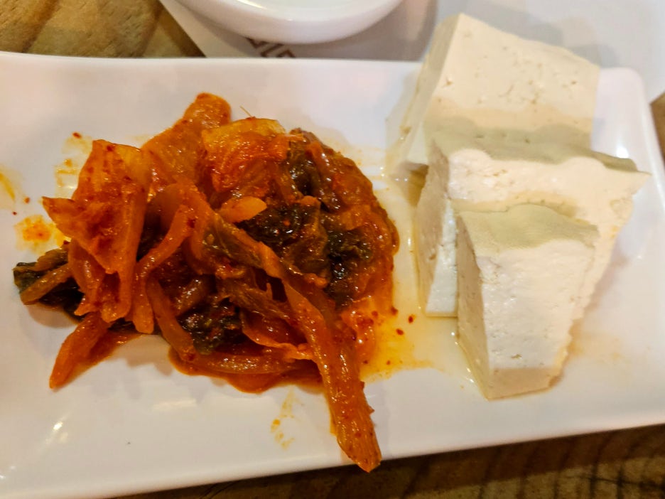 볶음 김치와 두부가 메인 반찬으로 나온다. 그리고 상큼한 절임류 반찬들도 있다. 다 맛있다.