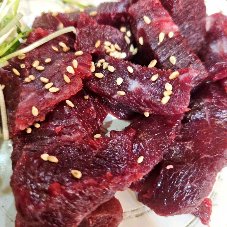 신선한 뭉티기 고기를 최고의 양념장에 찍어 먹으면,