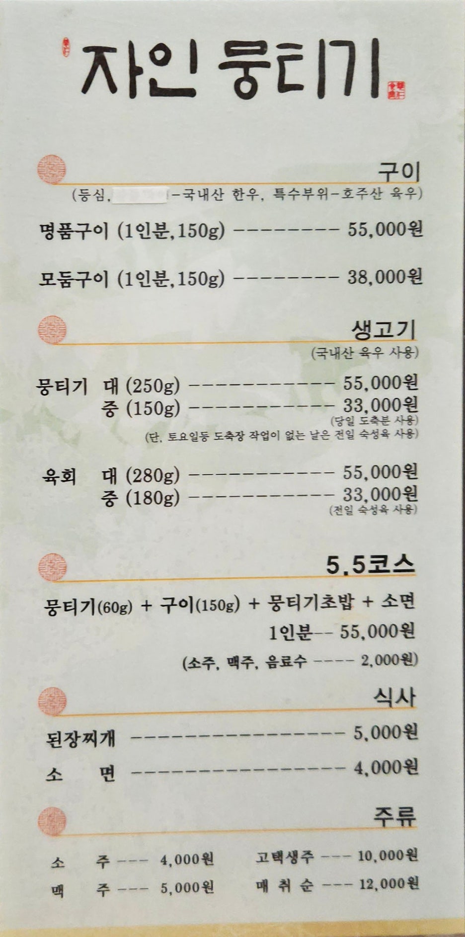 특히 이곳은 5.5 코스가 유명한데, 뭉티기와 생고기 구이를 함께 먹을 수 있는 구성.