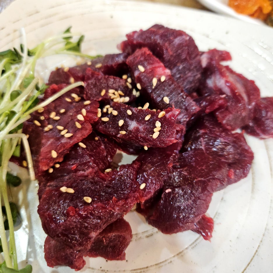 드디어 나온 뭉티기. 1인당 60g이니 보이는 사진은 총 120g. 아주 많은 양은 분명 아니긴 하다.