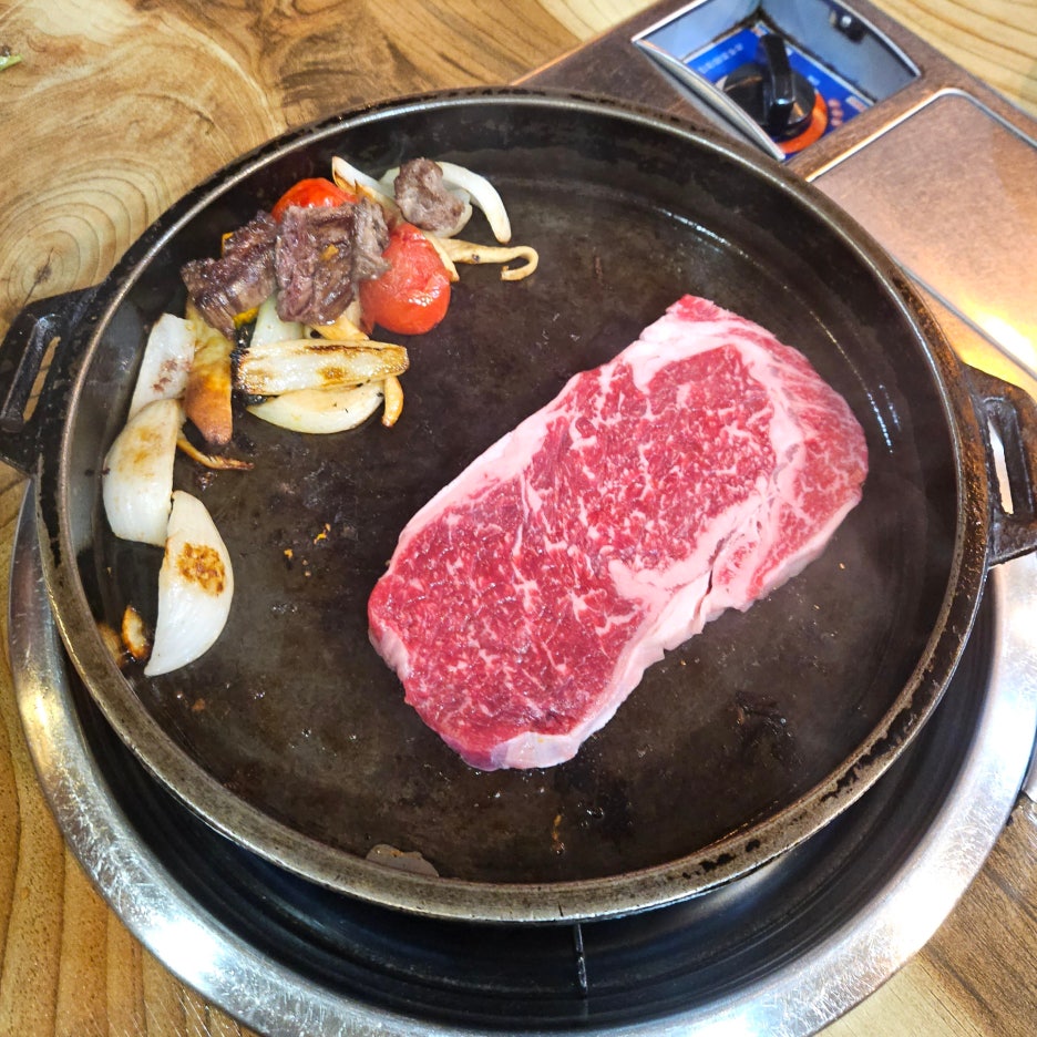 불판은 대도식당의 것처럼 무쇠판. 판에 기름칠을 하기 위해 먼저 차돌박이부터 채소들과 함께 잘 구워보자.