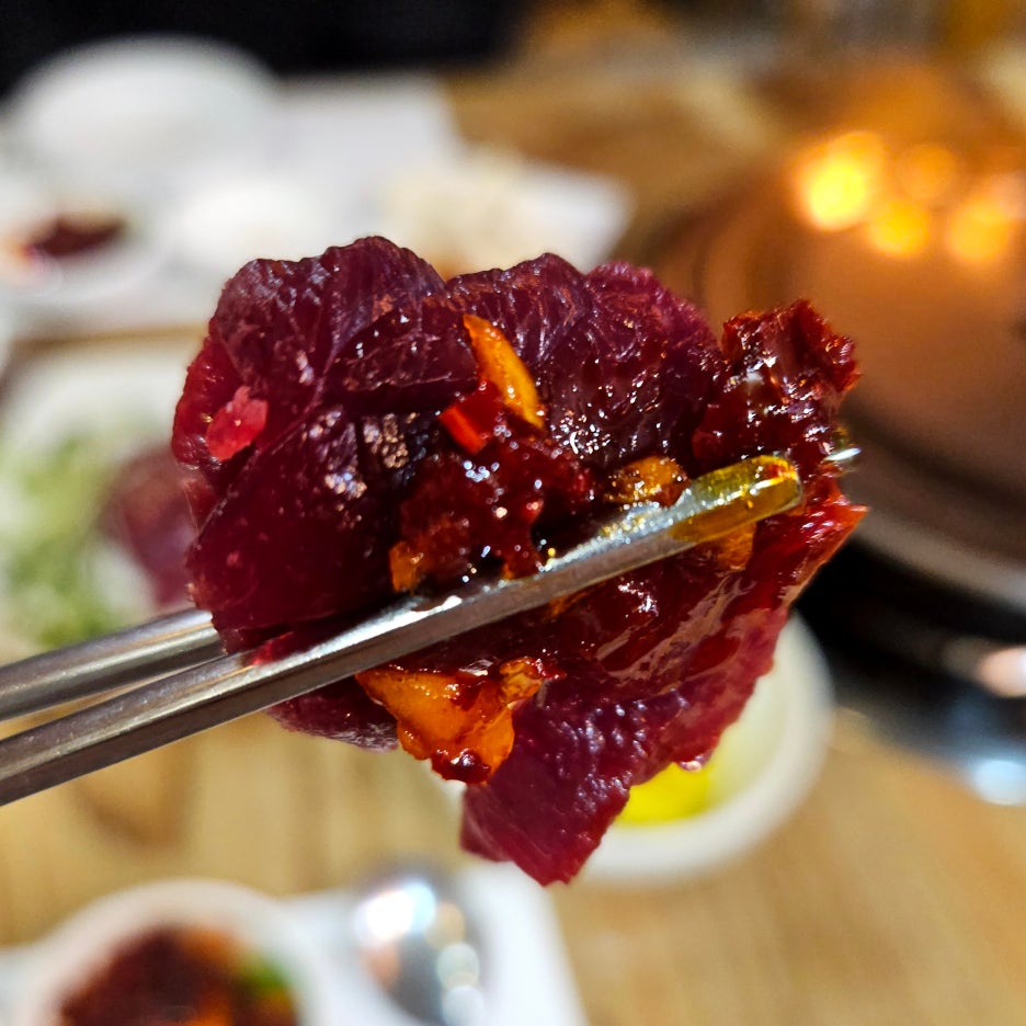 맛있는 양념장에 푸욱 담가 먹어보면, 뭉티기의 고소함과 양념장의 조화가 아주 극락이다.