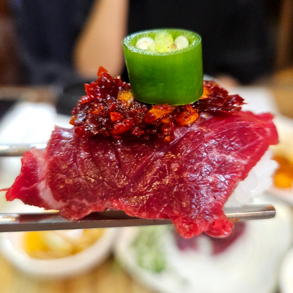 같은 생고기를 초로 양념한 밥 위에 올리고, 뭉티기 양념장과 고추가 한 조각씩 올라가 있다.