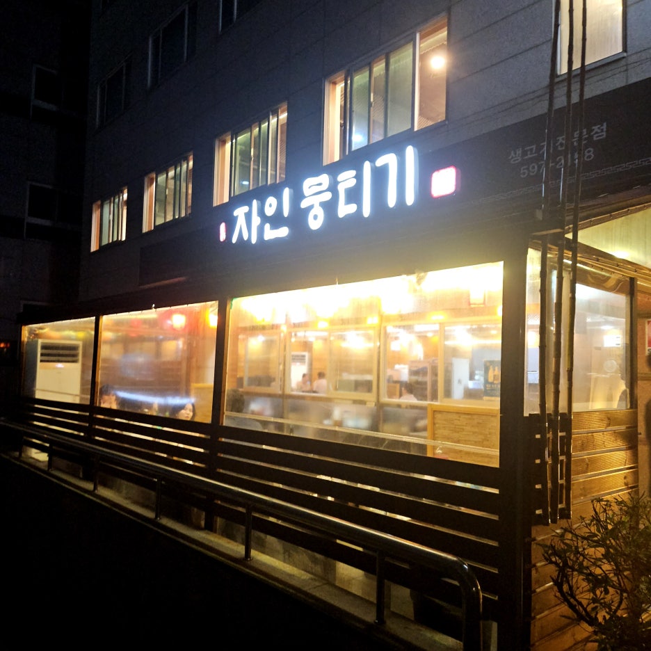 3호선 양재역 1,2번 출구 뒤쪽의 골목으로 들어가면 여러 식당들이 있는데, 가장 시끄럽고 사람 많은 곳 중에 하나가 이곳 자인 뭉티기이다.
