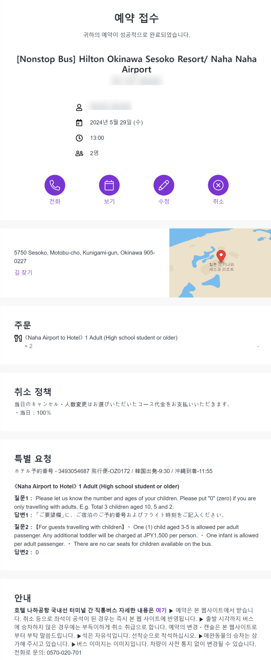 - 모토부항과 힐튼 세소코까지의 송영 버스는 사전 예약 필수