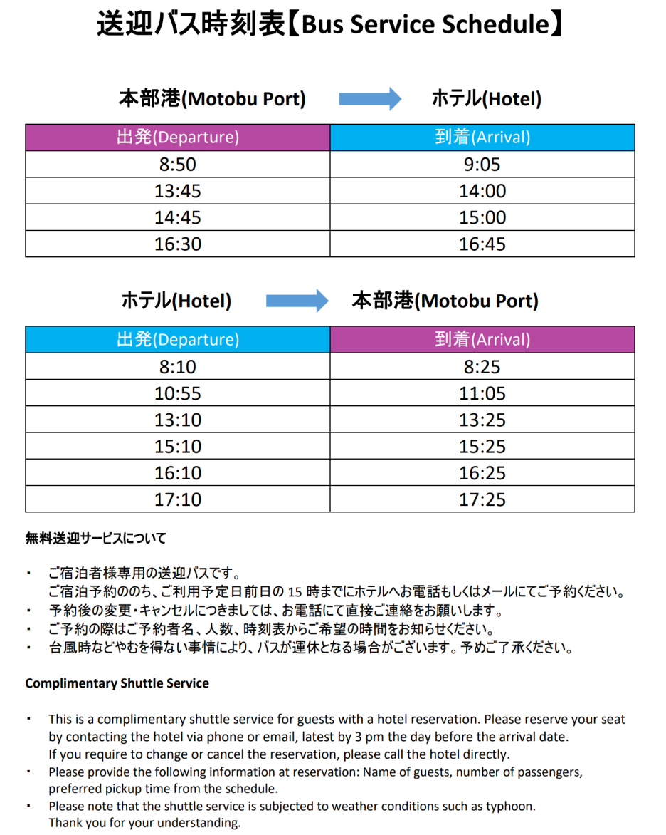 아래는 모토부항에서 내려 갈아타야 하는 모토부항 ⇔ 힐튼 세소코 간의 송영 버스 시간표이다.