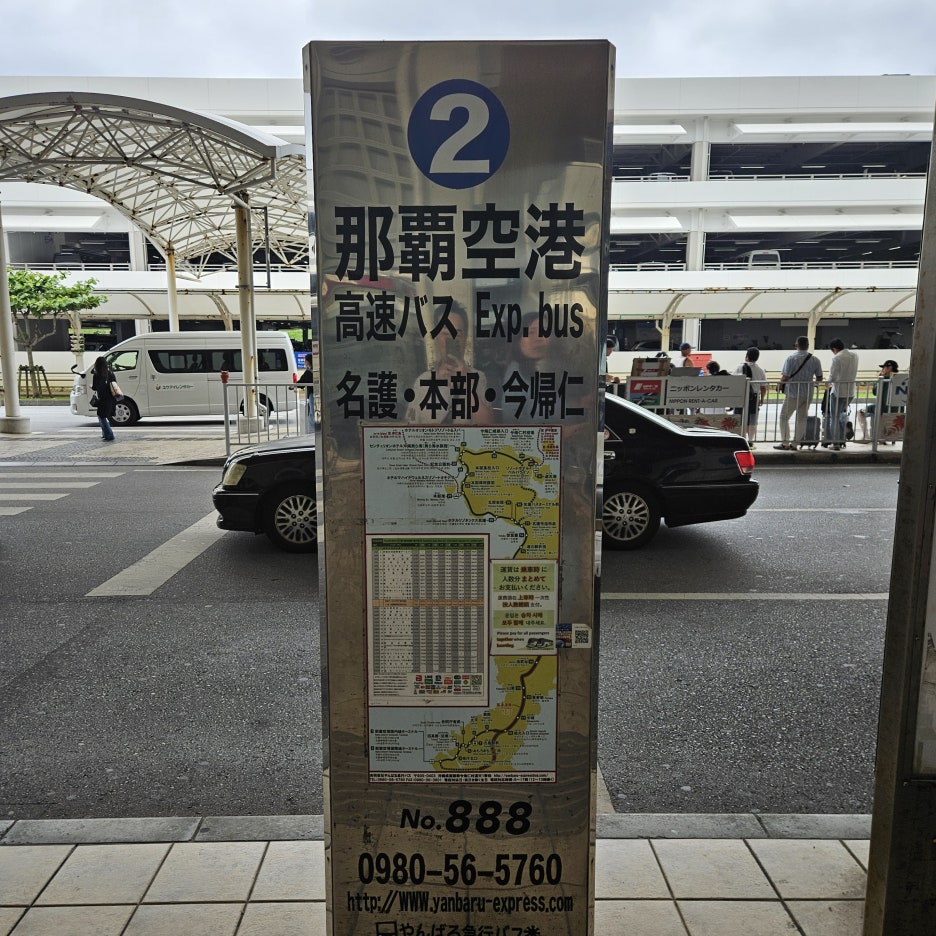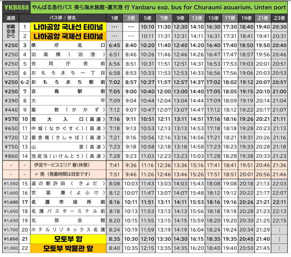 나하 공항 국내선에서 모토부항까지 가는 일반 노선버스인 YKB888의 노선 시간표는 아래와 같다.