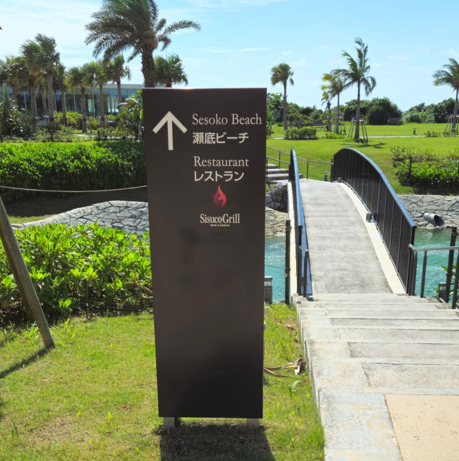 다리 앞에는 세소코 비치로 가는 길이라는 표지판이 있다.