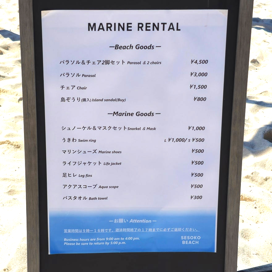 세소코 비칠을 관리하는 곳에서 운영하는 각종 렌털 물품의 가격. 힐튼 숙박자의 경우에는 바로 옆에서 따로 운영하는 곳이 있으니, 그곳을 이용하는 편이 좋다. 가격은 4500엔으로 동일하지만 조금 더 케어 받는 형태가 된다.