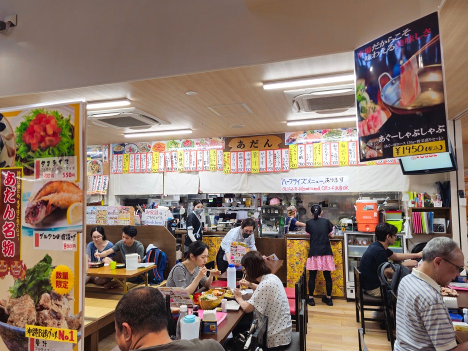 이 가게의 명물이라고 하는 음식들도 소개를 하고 있다. 타코라이스, 고야 참푸르, 카이센동, 오키나와 B급 음식 뼈국, 모즈쿠 튀김 등이 적혀 있다. 재료를 가지고 오지 않아도 이렇게 다양한 음식들을 맛볼 수 있는 곳이었다.