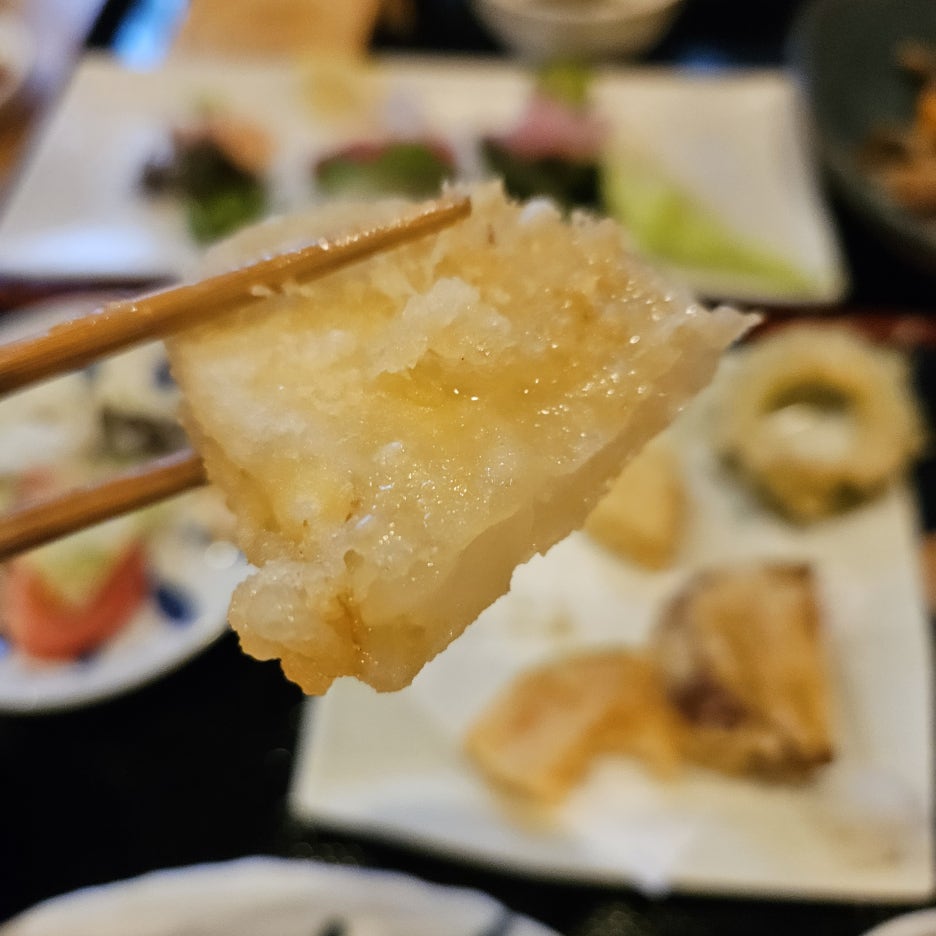제일 좋아하는 가지부터 먹어보니, 부드러운 육즙이 가득 차있다. 독특하게도 무도 이렇게 튀김으로 내어준다. 무 튀김은 아마도 처음 먹보는 것일 듯.