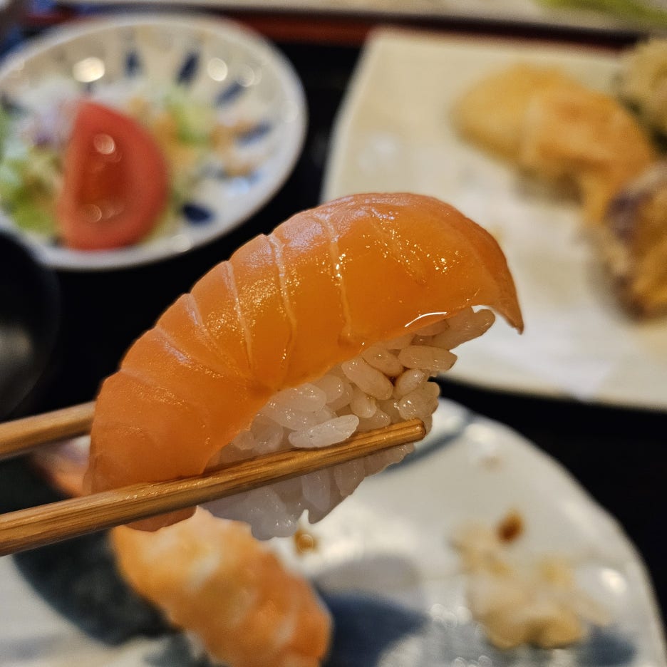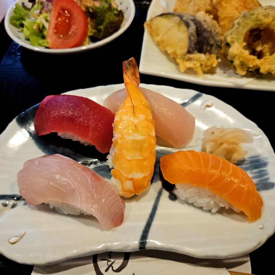 일본 전통 식당에서 꼭 먹어 보고 싶었던, 튀김 세트이다. 아무래도 일본은 튀김의 나라이니 웬만하면 튀김의 퀄리티가 뛰어나리라는 생각에 주문했다. 간단한 샐러드와 튀김 한 판, 그리고 스시로 구성되어 있다. 밥은 포함되어 있지 않지만, 스시가 있으니 충분했고 미소 지루와 차완 무시로 구성되어 있다.