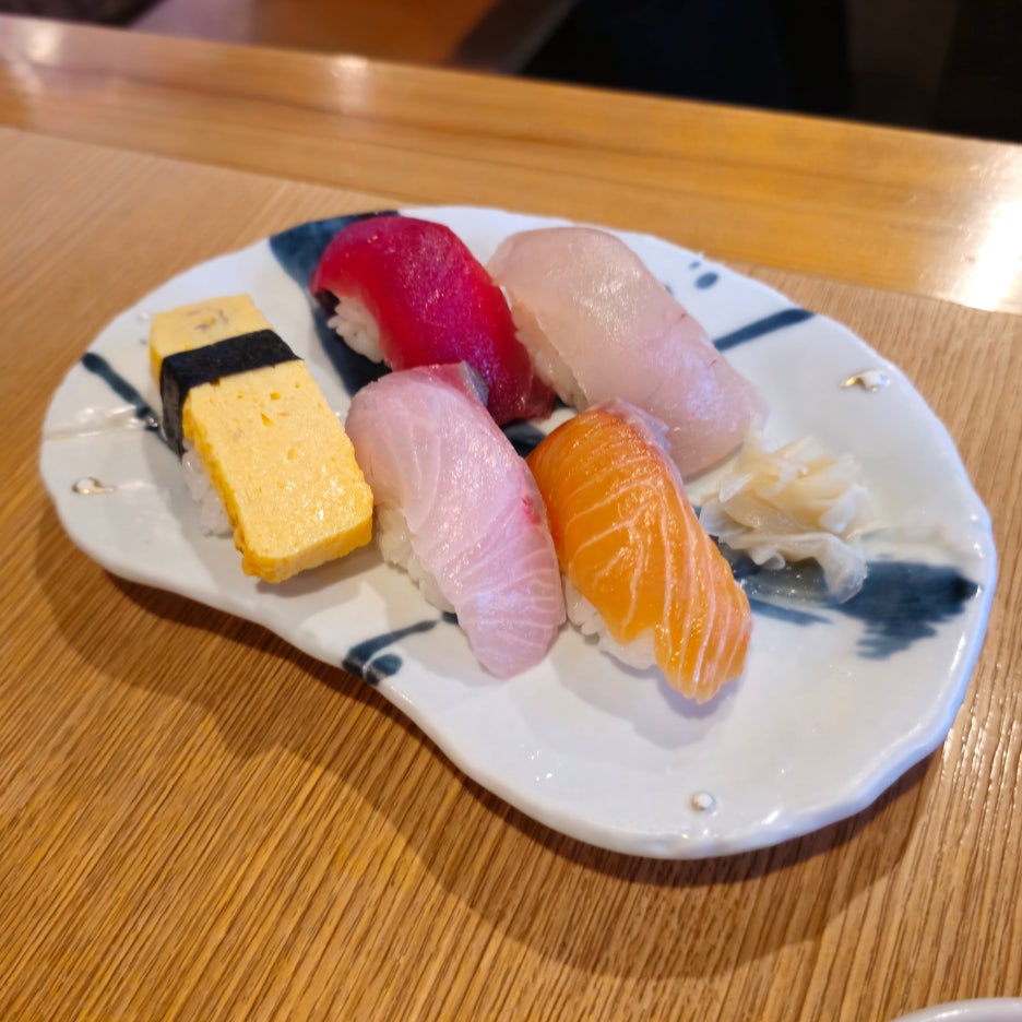 추가로 주문한 단품 스시. 스시가 조금 더 먹고 싶어서 주문했다. 달걀, 참치, 연어, 잿방어, 청새치 이렇게 5점이 나온다. 역시 이 스시들도 퀄리티가 상당했다.