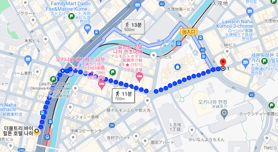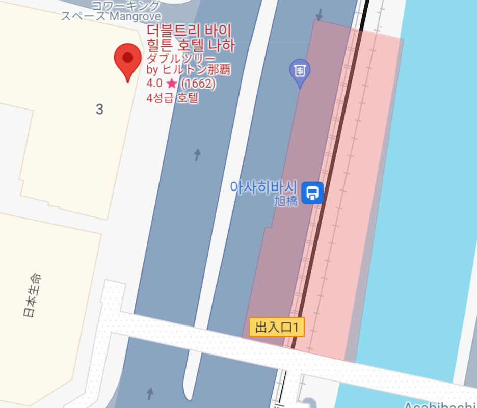 아사히바시 역과 연결되어 있는 육교를 건너서 내려오면 약 30m 앞에 더블트리 나하의 입구가 있기 때문.