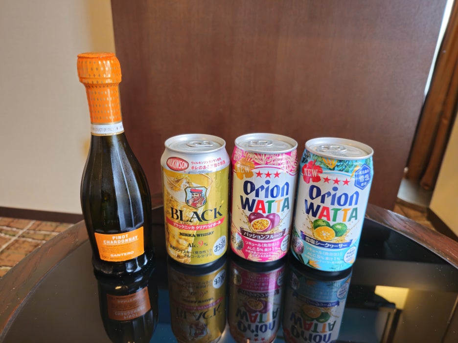 그래도 이렇게 챙겨주는 게 어디인가... 우리는 와이트 와인 하프 보틀 하나와, 하이볼, 오리온의 사와 두 종류를 선택했다. 하이볼은 니카 블랙 위스키를 사용한 것이었다.