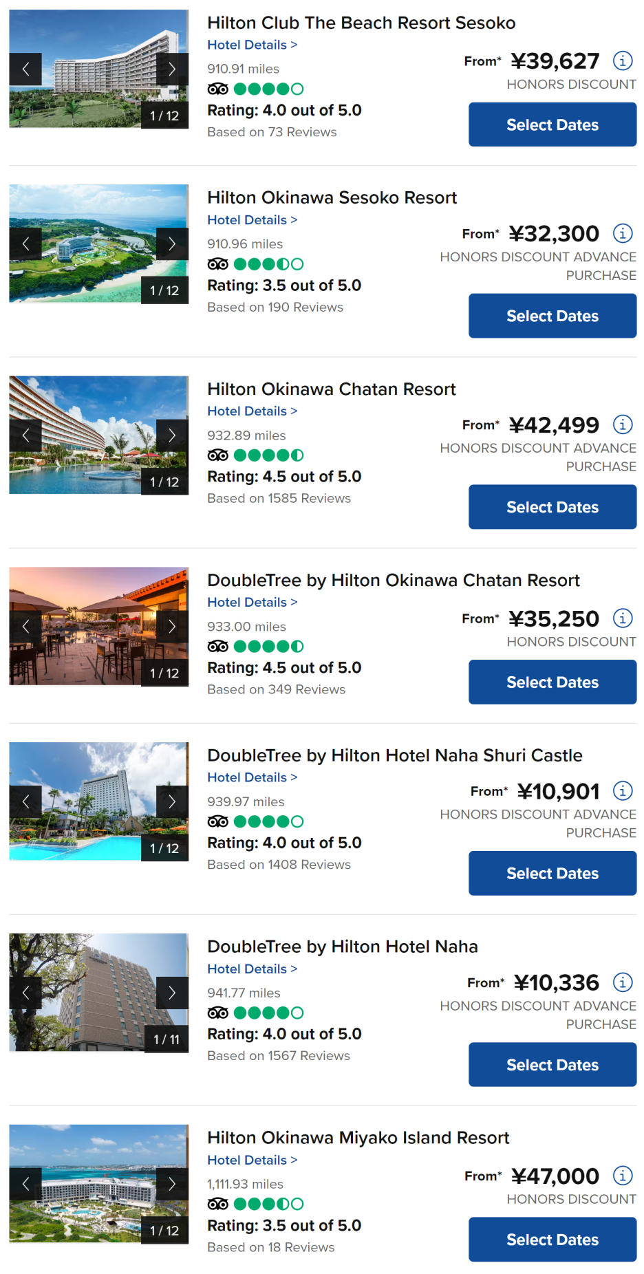 나하 시내에는 더블트리가 두 곳이 있고, 아메리카 빌리지로 유명한 차탄에도 힐튼 리조트, 더블트리 각각 한 곳씩 총 두 곳이 있는 형태. 마지막으로, 세소코섬에는 힐튼 리조트 한 곳과 힐튼 그랜드 베케이션 회원이 머물 수 있는 힐튼 클럽 한곳이 있으며, 우리는 힐튼 리조트에서 3박을 하였다.