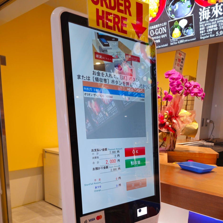 옆집인 카이센동을 파는 매장에서 오리온 생맥주와 야키토리 2꼬치를 구입한다. 주문은 키오스크로 가능하다.