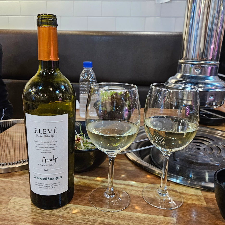 콜키지 1병 무료라서, 가지고 간 저렴이 와인. 감사하게도 잔까지 잘 준비를 해주셨다.