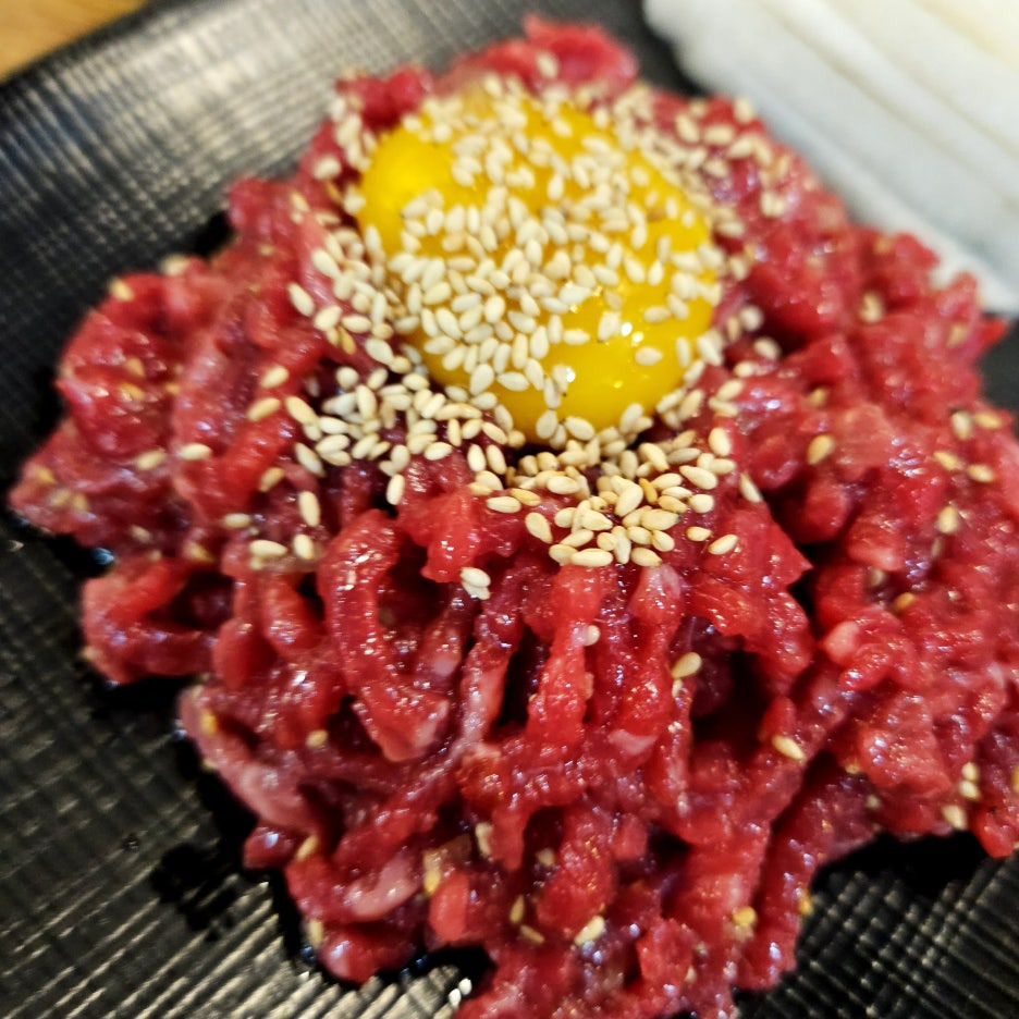 빠르게 허기를 달래기 위해 주문한 육회. 반 접시 100g을 시킬까 한 접시 200g을 시킬까 고민을 하다, 가격이 200g이 더 유리해서 한 접시로.