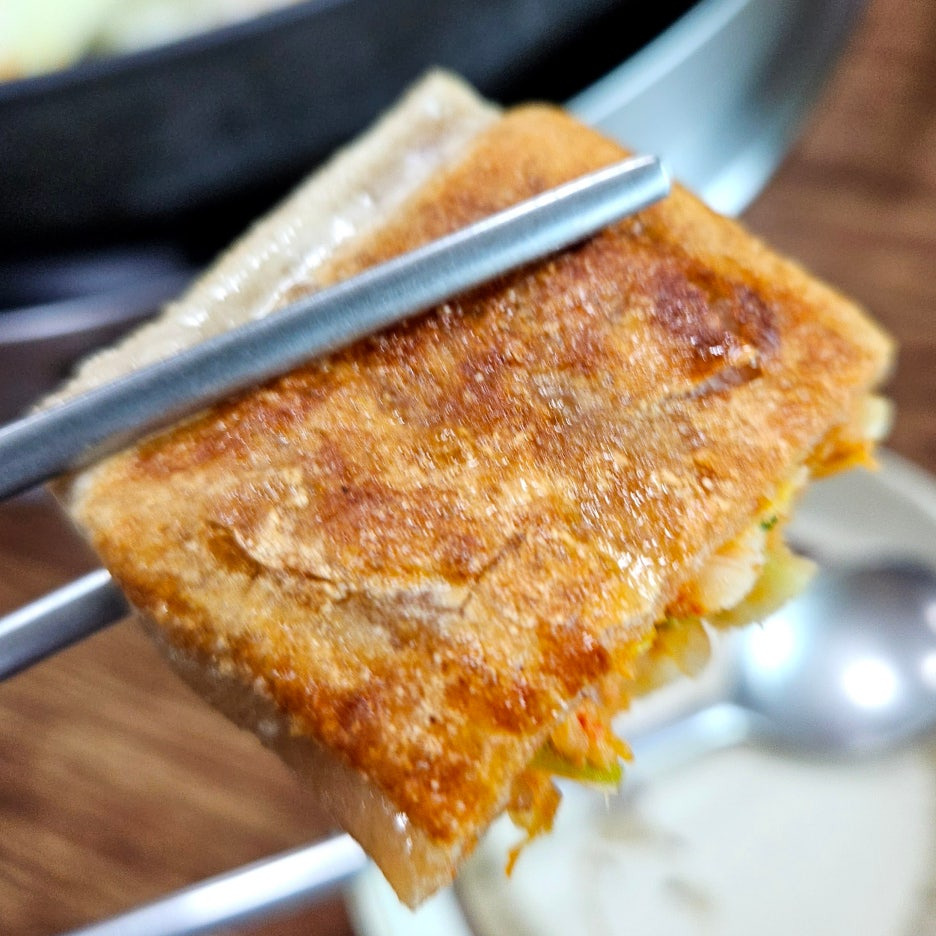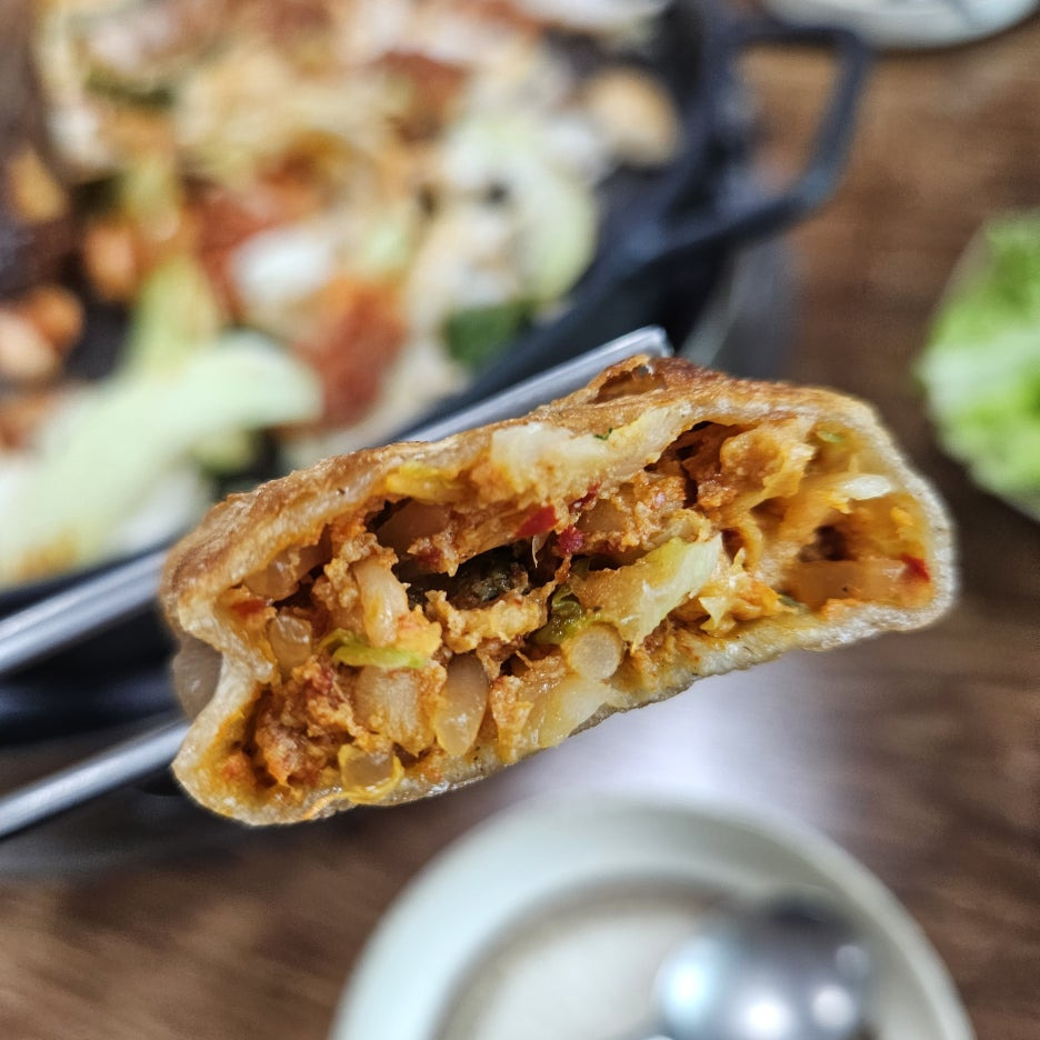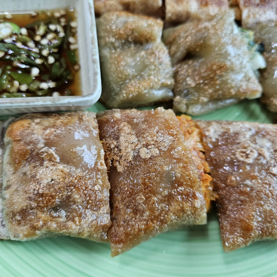 먼저 매콤한 메밀전병. 김치가 들어간 것이 살짝 맵지만 기름진 옷의 고소함이 더 강하다. 바삭해서 맛있다.