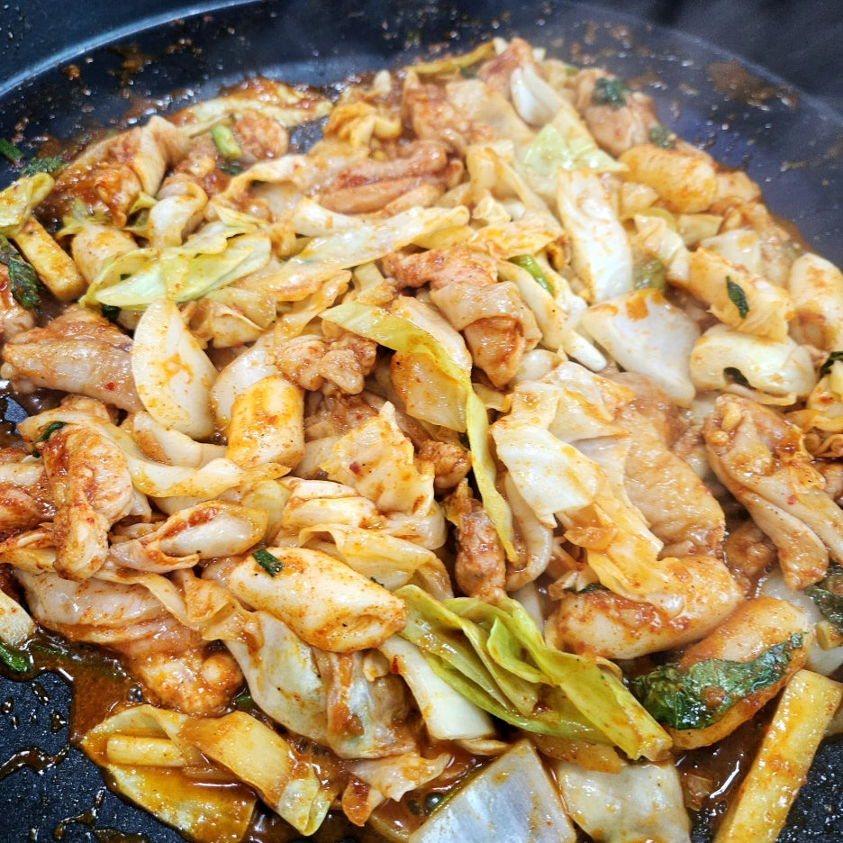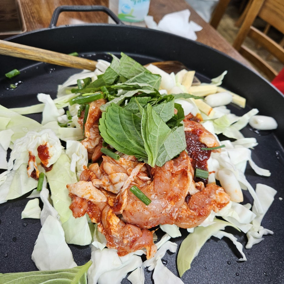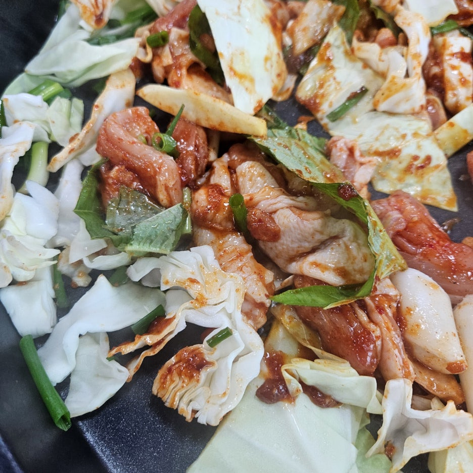 닭고기와 양배추, 그리고 깻잎과 떡.