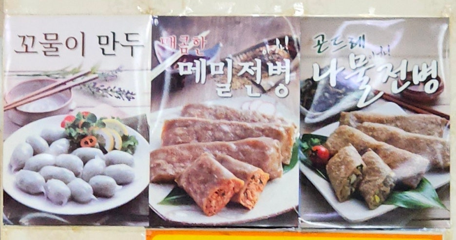 사이드 메뉴로 인기 있는 것은 꼬물이 만두, 메밀전병, 나물전병인듯 하다.