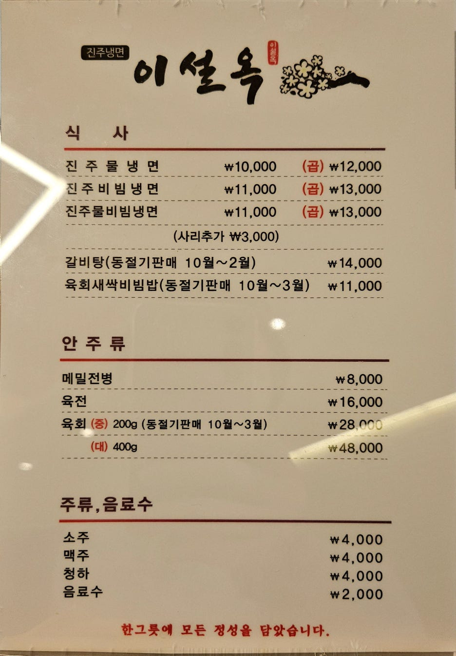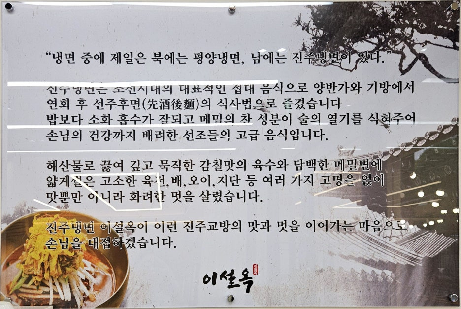 진주냉면에 맛을 제대로 알게 된 것은 실비집을 투어하기 위해 방문한 경남 사천을 여행할 때이다. 그전에 백종원 씨가 운영했던 본 갈비에서 한번 진주냉면을 먹어보았지만, 정말 맛이 없었다. 해물 육수는 비린 맛이 강했고 면도 마트에서 파는 느낌의 면이었다. 이후 진주와 사천에서 유명한 하주옥을 방문하면서 정말 제대로 된 진주냉면을 맛보게 되었고 진심 훌륭한 맛과 푸짐한 서비스로 인해 진주냉면에 빠져버렸다.