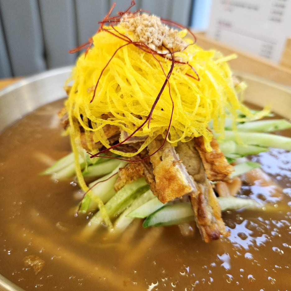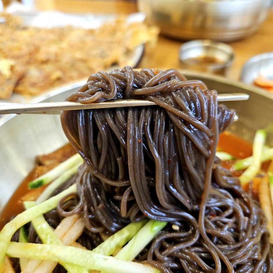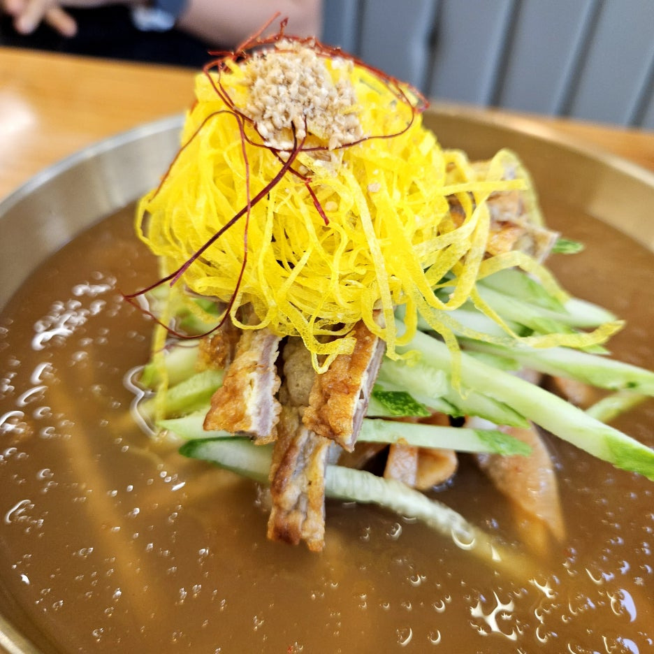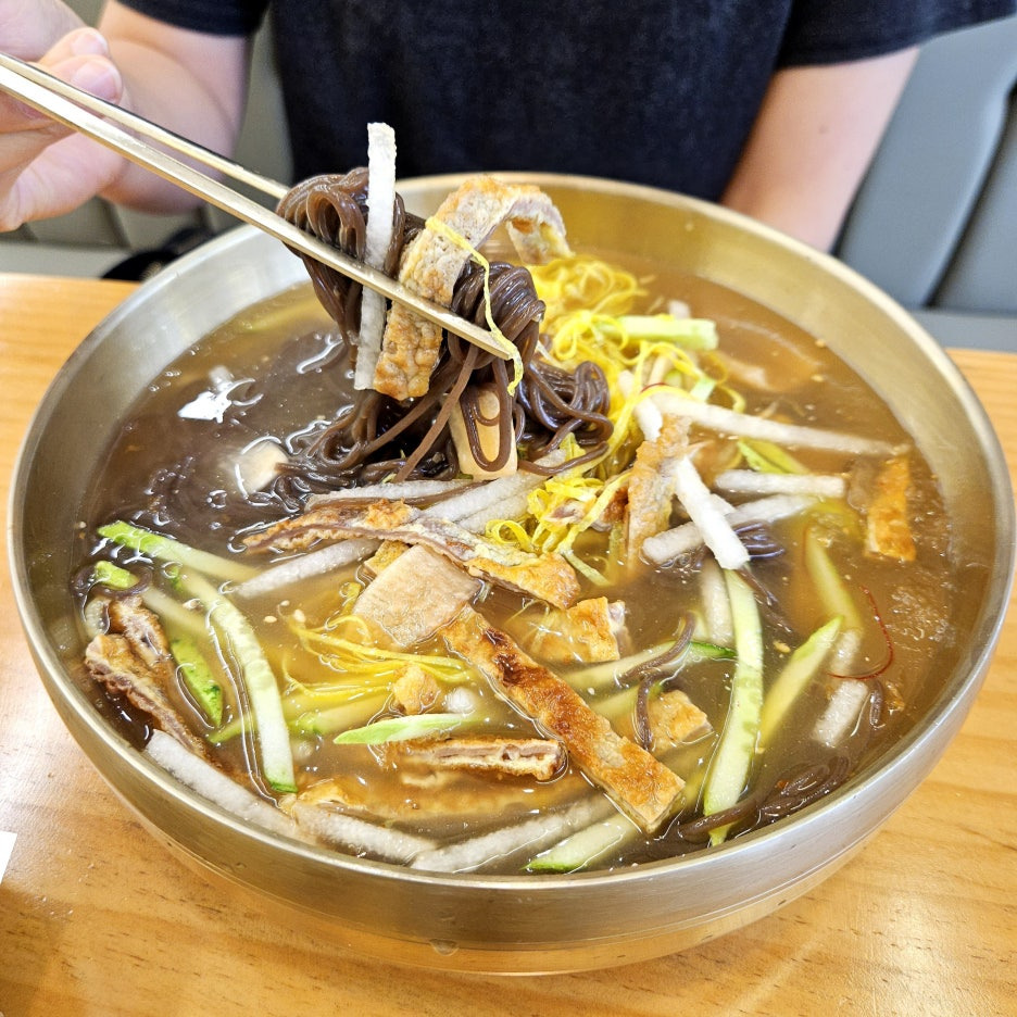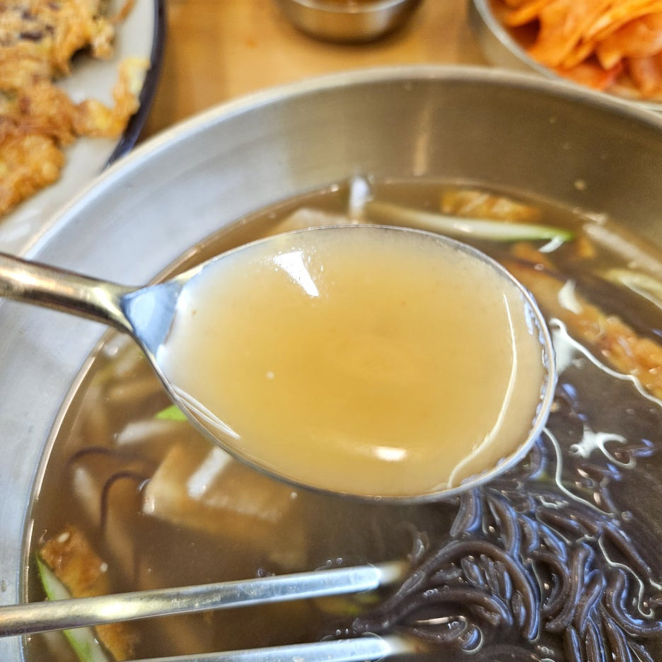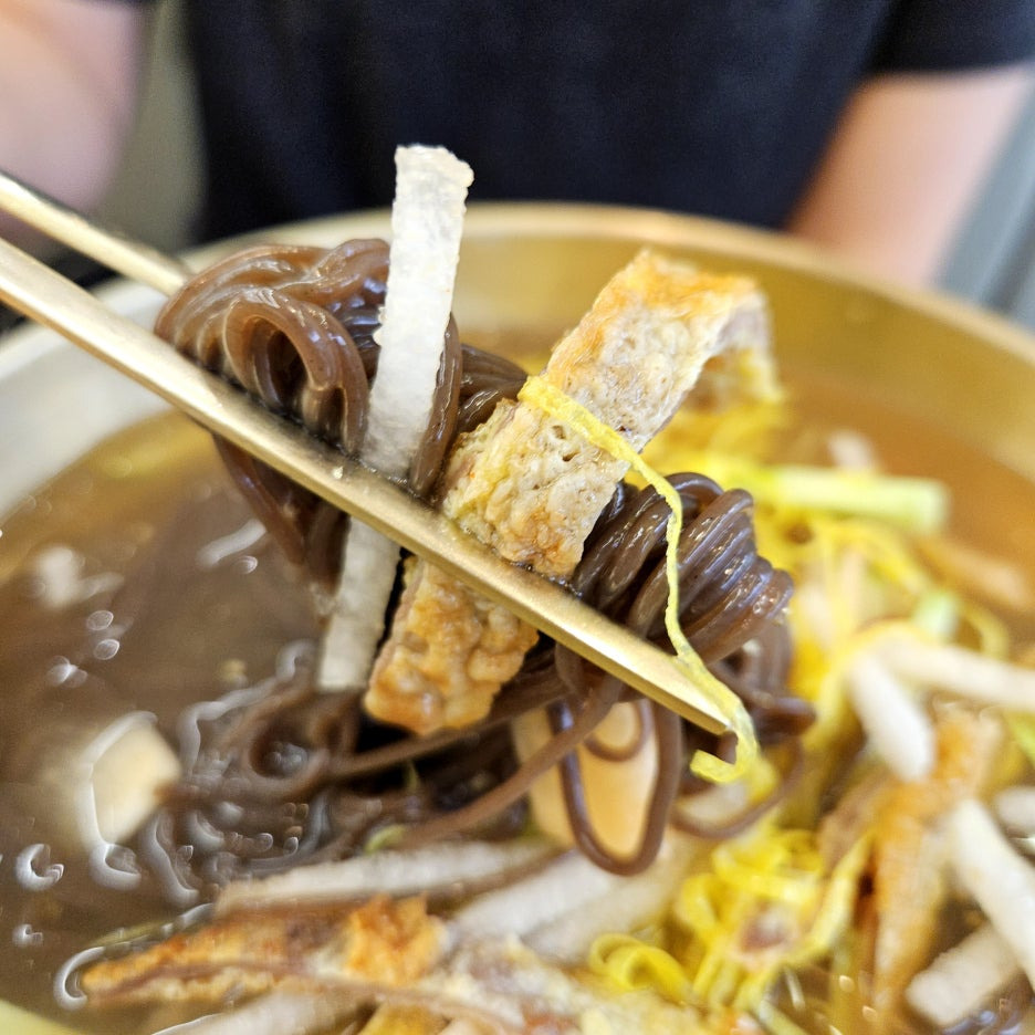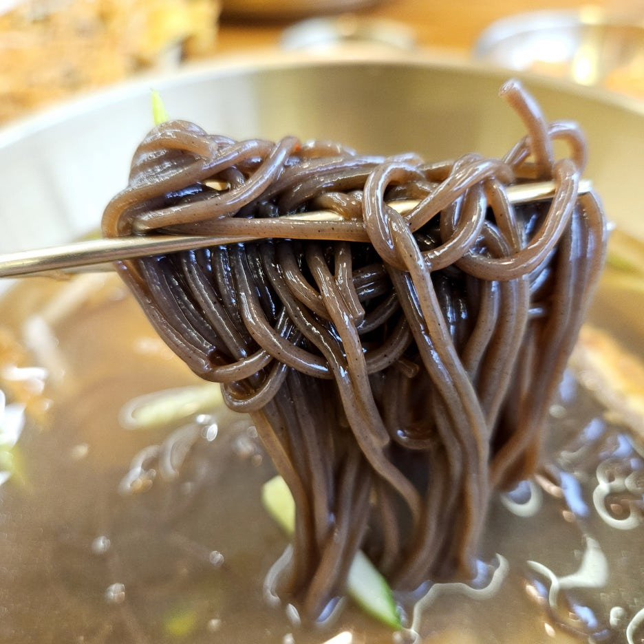 면은 살짝 미끄덩거리지만, 쫄깃하다. 메밀면과는 다른 부류지만 이것도 이 나름대로의 훌륭한 맛을 가지고 있다.
