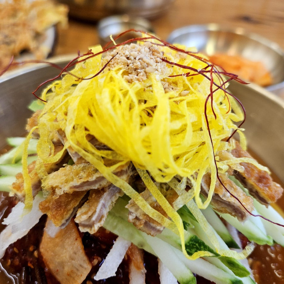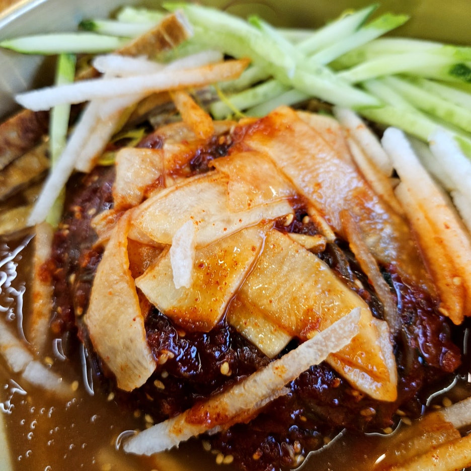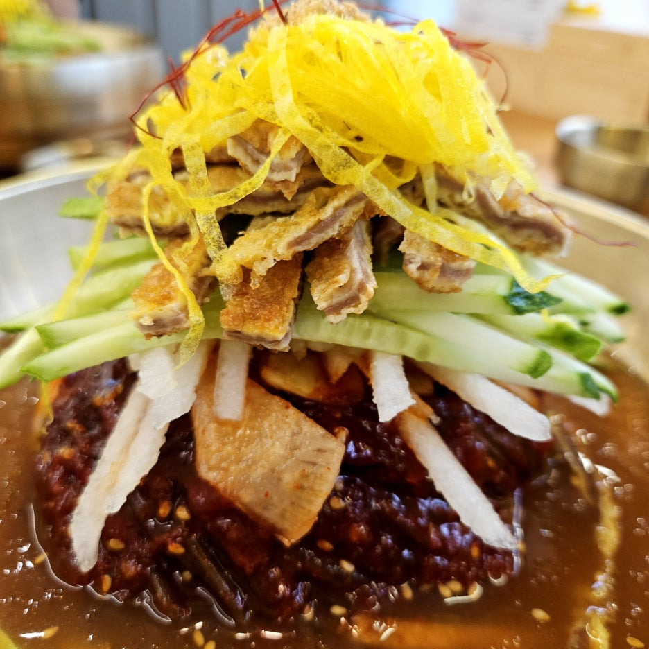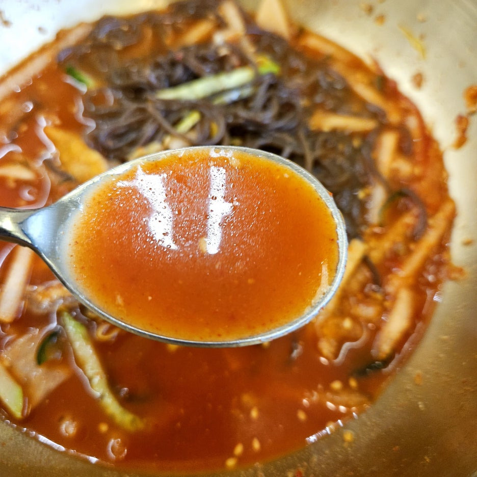 육수 자체의 맛은 상당히 사라지고, 비빔장의 맛이 강하게 나는 국물이다. 이런 부분에서는 물냉면이 훨씬 육수의 맛이 좋다.