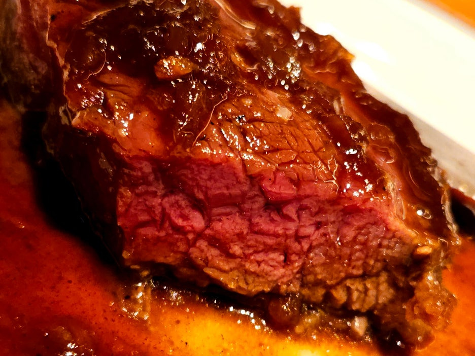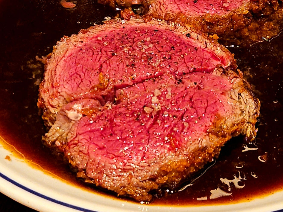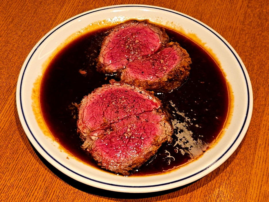 소 안심을 레어로 오랜 시간 구워 낸듯하며, 겉은 빵가루를 입힌 튀김의 모습.