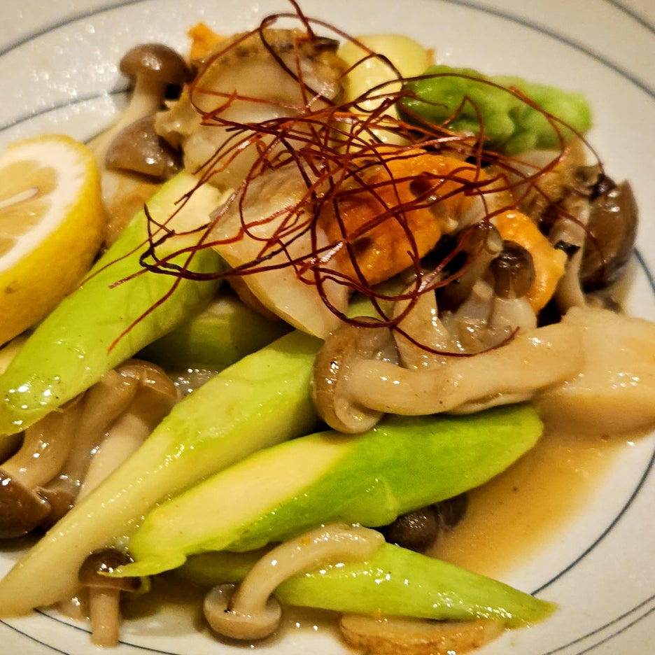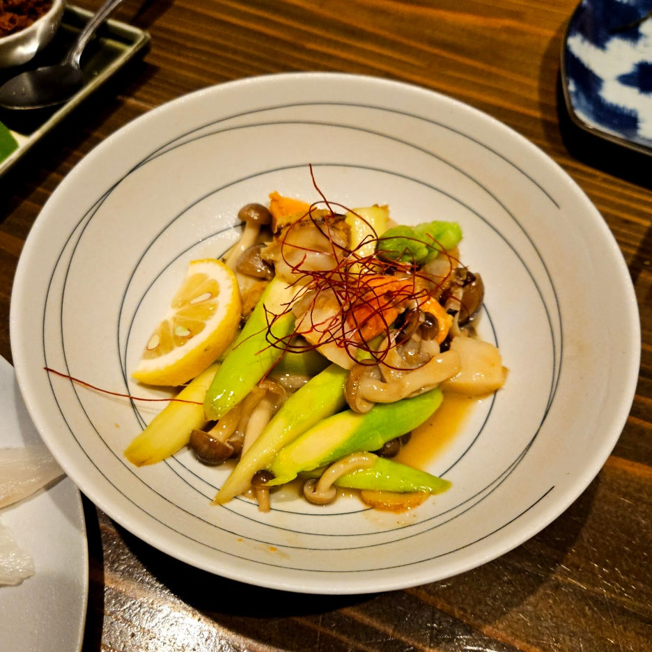 일본에서 자주 볼 수 있는 버섯들과 함께 볶아진 아스파라거스와 가리비들.