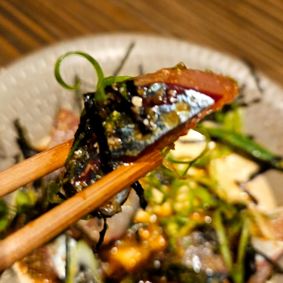 신선한 고등어 회에 고소한 참깨소스가 한가득. 김과 파 등의 각종 야채들이 토핑이 되어 있다.