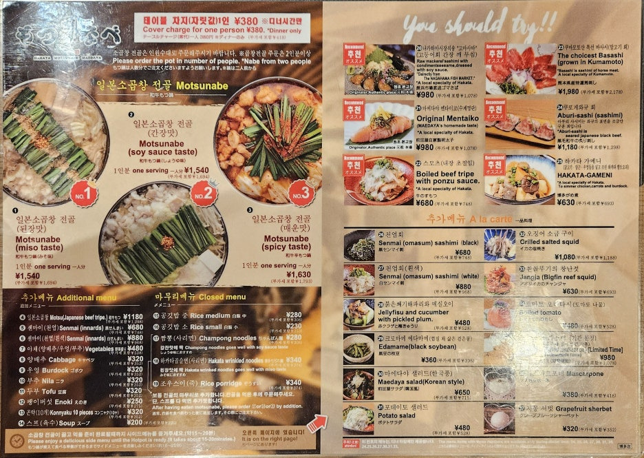 모츠나베를 판매하는 음식점은 후쿠오카에도 엄청나게 많이 있는데, 그중에서도 마에다야가 요즘은 가장 인기가 높은 듯하다. 그래서 이번 후쿠오카 방문 시에는 늘 가던 라쿠텐치를 버리고, 이곳에 방문하였다.