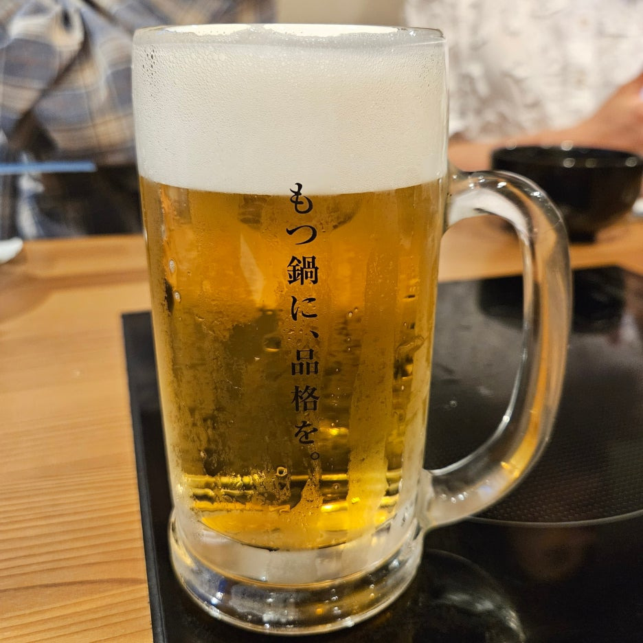 워낙 더운 7월 말의 날씨였기에, 바로 생맥주를 주문했다. 물론 한겨울이었더라도 주문을 했을 거긴 하다. 풍부한 거품이 일단 눈을 사로잡는다. 그리고, 잔은 마에다야 전용잔이다. 뒤쪽에는 물수건과 똑같이 "모츠나베에 품격을!"