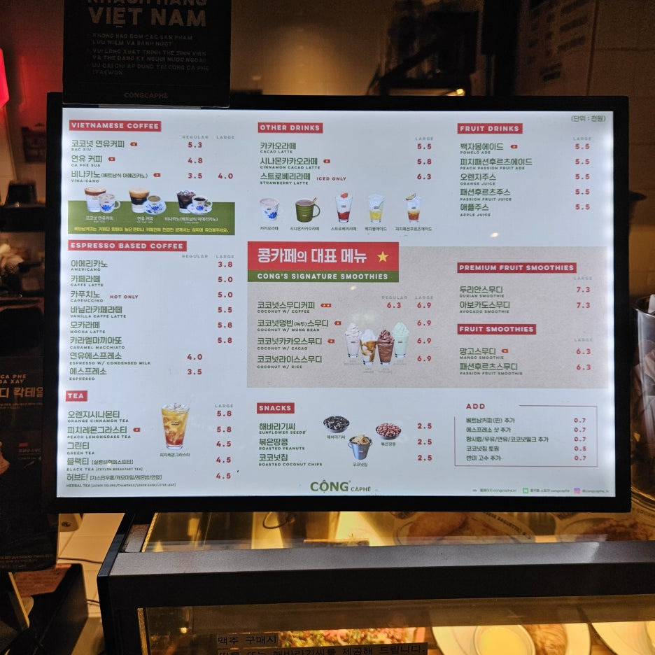 입구에서 메뉴를 보니, 베트남에서 먹었던 메뉴들이 보였다. 날씨도 정말 더웠던 8월 초라, 시원한 코코넛 스무디가 간절했다.