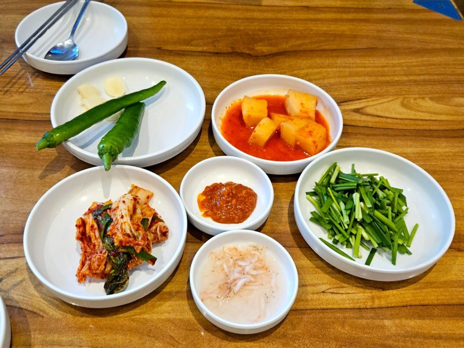 김치와 깍두기가 메인인 간단한 상차림. 맵지 않은 고추와 부추까지.