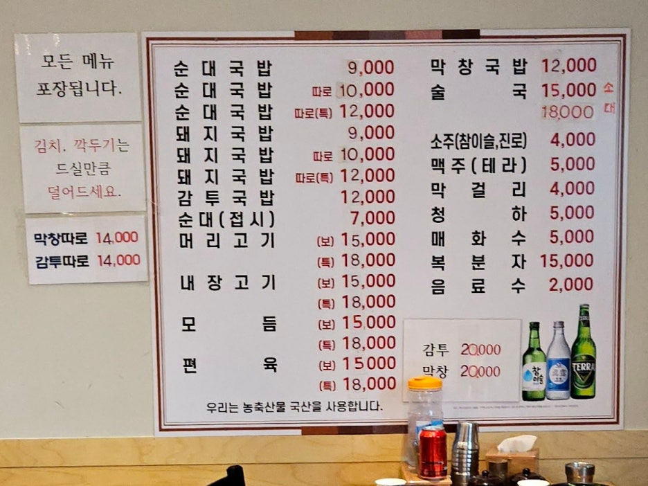 9천 원으로 요즘으로는 저렴한 가격의 순대 국밥. 밥이 말아져 나오는 방식이다. 따로 국밥보다 토렴 형식으로 나오는 국밥이 훨씬 좋다.